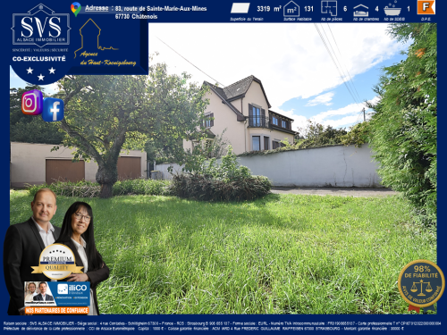 Raison sociale : SVS ALSACE IMMOBILIER - Siège social : 4 rue Contades - Schiltigheim 67300 – France – Antennes à Châtenois, Geudertheim, Val d’Argent, Val de Villé, Vosges, Mulhouse (Illzach), Colmar - RCS : Strasbourg B 908 655 137 - Forme sociale : EURL - Numéro TVA Intracommunautaire : FR31908655137 - Carte professionnelle T n° CPI67012022000000004 Préfecture de délivrance de la carte professionnelle : CCI de Alsace Eurométropole Capital : 1000 € - Caisse garantie financière : ACM IARD 4 Rue FREDERIC GUILLAUME RAIFFEISEN 67000 STRASBOURG - Montant garantie financière : 30000 €